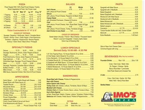 Imos Printable Menu. Restaurantfoodmenu is an online guidance for imo's menu, providing prices information of imo's breakfast, specials, kids,. Sausage, bacon, pepperoni, canadian bacon, pizza.