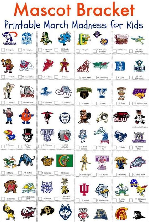 Kidfriendly Mascot Bracket for 2017 March Madness March madness