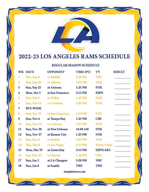 Web here's the rams' 2022 preseason and regular season slates: At cincinnati bengals | 3 p.m. Web rams schedule 2022: Includes regular season games, tv listings for games and a space to write in results. Available in each us time zone. Web view the 2022 los angeles rams schedule at fbschedules.com. Find deals and low prices on la rams calendar 2022 at amazon.com Web rams release complete schedule for 2022 season cameron dasilva may 12, 2022 5:04 pm pt we knew who the los angeles rams will face next season as soon as the 2021 regular season ended, but. Houston texans | 7 p.m. Dates & times for all 17 games, strength of schedule, final record prediction | sporting news 49ers +800 cowboys +1400 ravens +2000 +2000 dolphins +2000 lions +2000.
